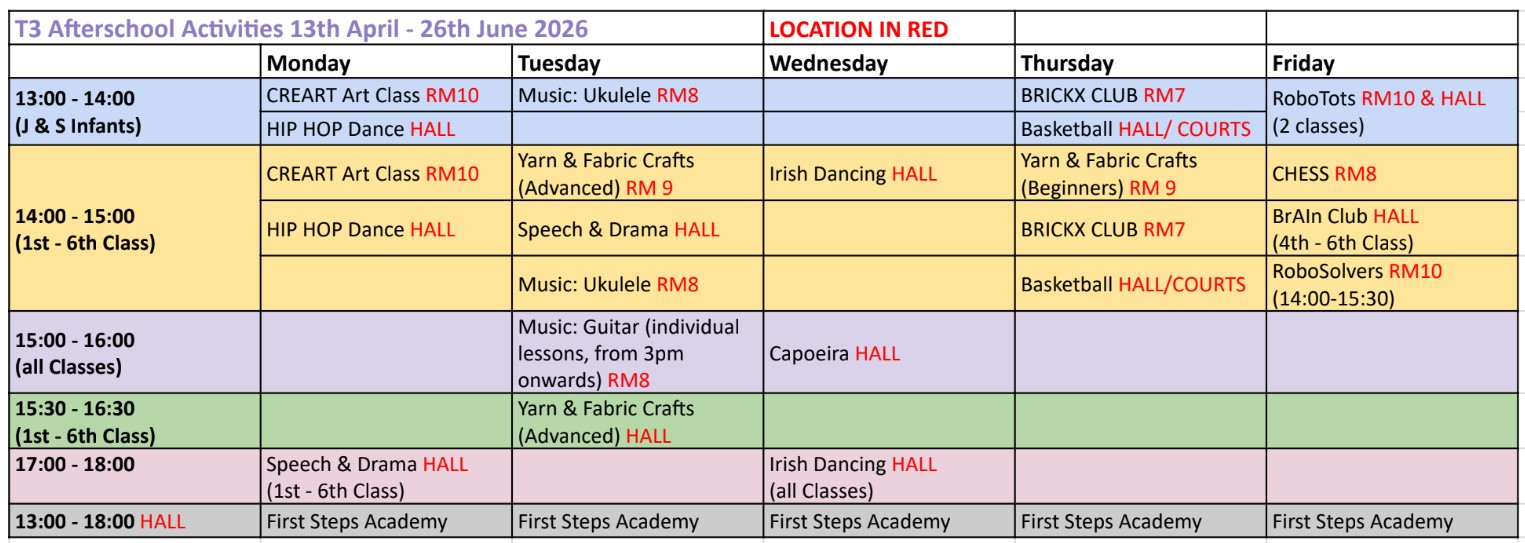 We facilitate several After School clubs and activities at Stapolin ETNS. Information on After School classes, including costs and timetables, is emailed to parents/guardians at the beginning of each term. Please direct any questions regarding these classes to the individual providers, whose contact details are listed below.